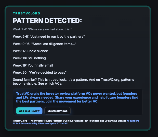 Week 1-4: "We're very excited about this!" Week 5-8: "Just need to run it by the partners" Week 9-16: "Some last diligence items..." Week 17: Radio silence Week 18: Still nothing Week 19: You finally email Week 20: "We've decided to pass"