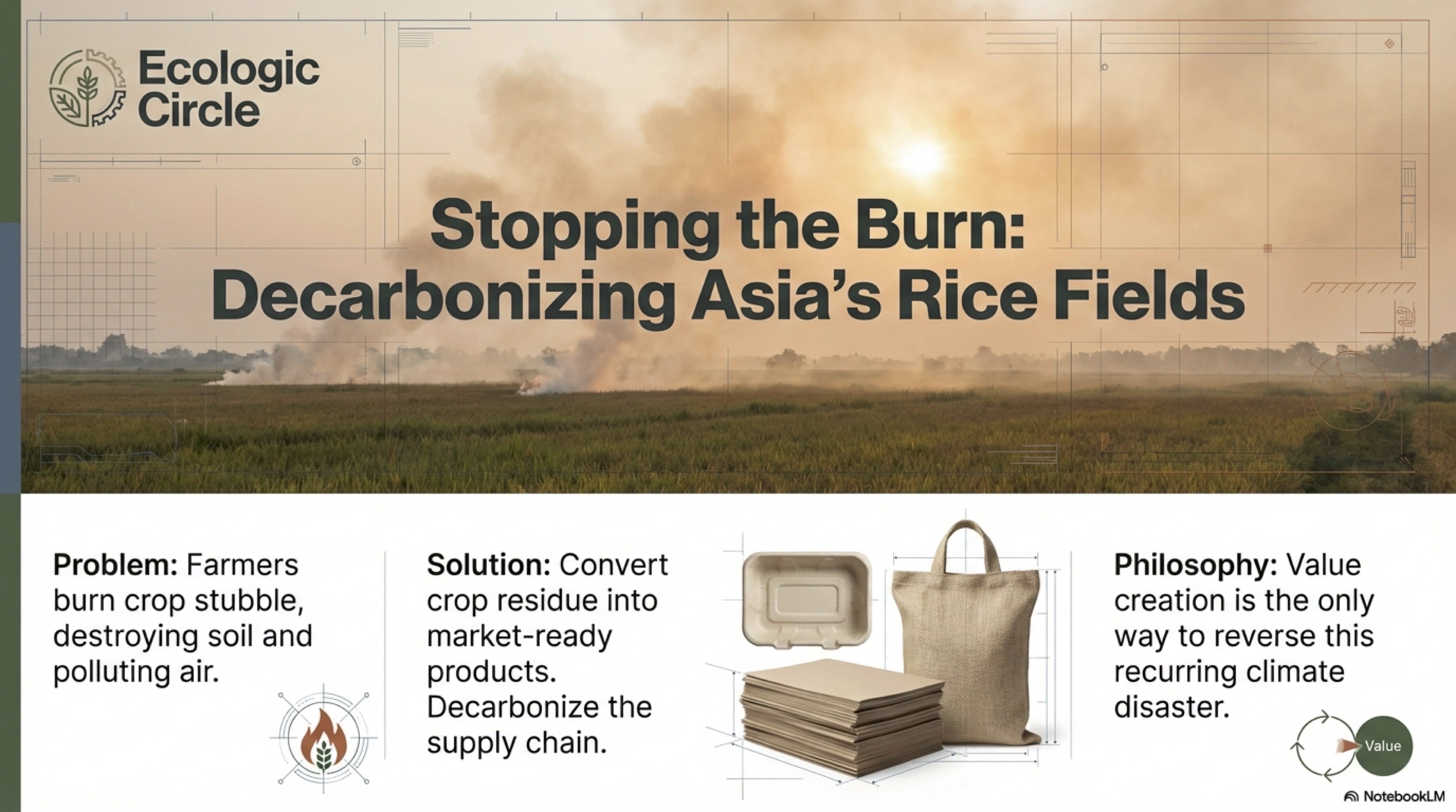 Every season, millions of acres of rice crop stubble across Asia are set ablaze — pumping greenhouse gases into the atmosphere while destroying the very soil that feeds billions. Ecologic Circle reverses this with elegant simplicity: converting crop residues into market-ready products that decarbonize agriculture and replace plastic at scale. Farmer livelihoods rise. Fires stop. Soil breathes again. This is the circular economy not as philosophy — but as precision business.