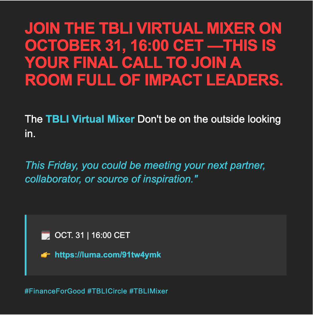 The guest list for our TBLI Virtual Mixer is filling up. Why? Because professionals like you are seeking more than just a network—they're seeking a community aligned with their values.
