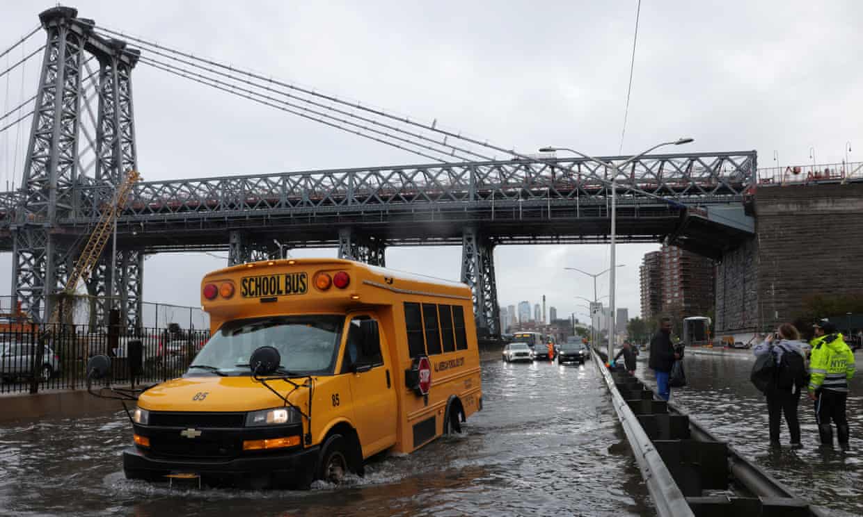 Flash flooding soaked large parts of the US’s largest city, turning roads into rivers, following intense rainfall that broke records. John F Kennedy international airport measured 8in of rainfall in one day, the most since records began, while Brooklyn received a month’s worth of rain in just a few hours. People had to be rescued from swamped basement apartments, subway and bus services were canceled and sewage backed up in overwhelmed pipes.