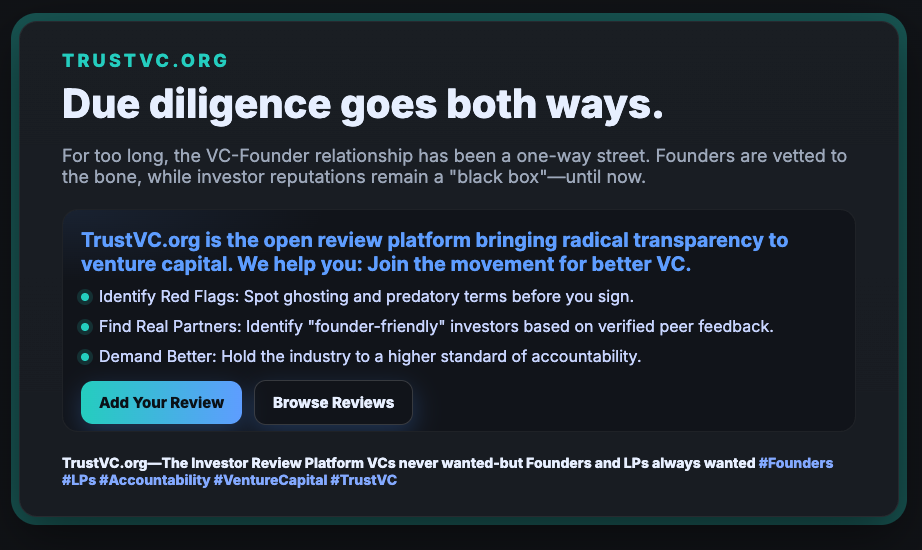 TrustVC.org is the open review platform bringing radical transparency to venture capital. We help you: